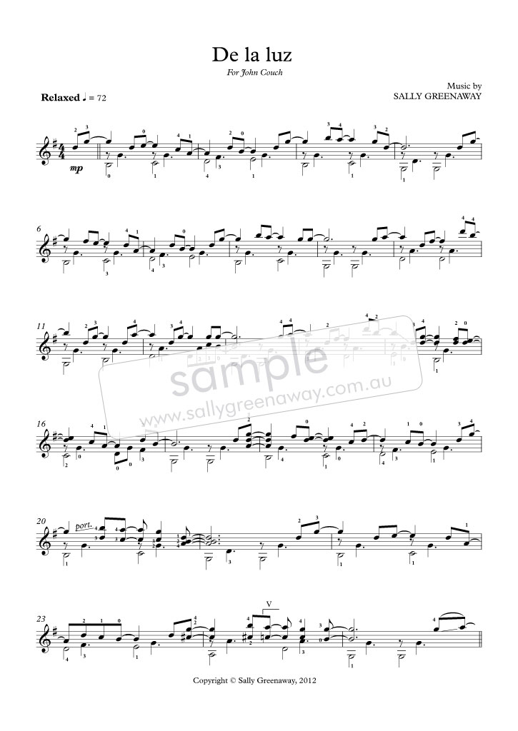 De la Luz - in the light. Delicately unfolding with hints of jazz and folk sensibilities. This piece accompanies Sin Luz as part of a set of contrasting works for guitar by John Couch. Given the beauty and popularity of this piece, the composer has since re-arranged it for other instruments and re-named these versions as Encore de Lirico to distinguish them from the original solo guitar version.