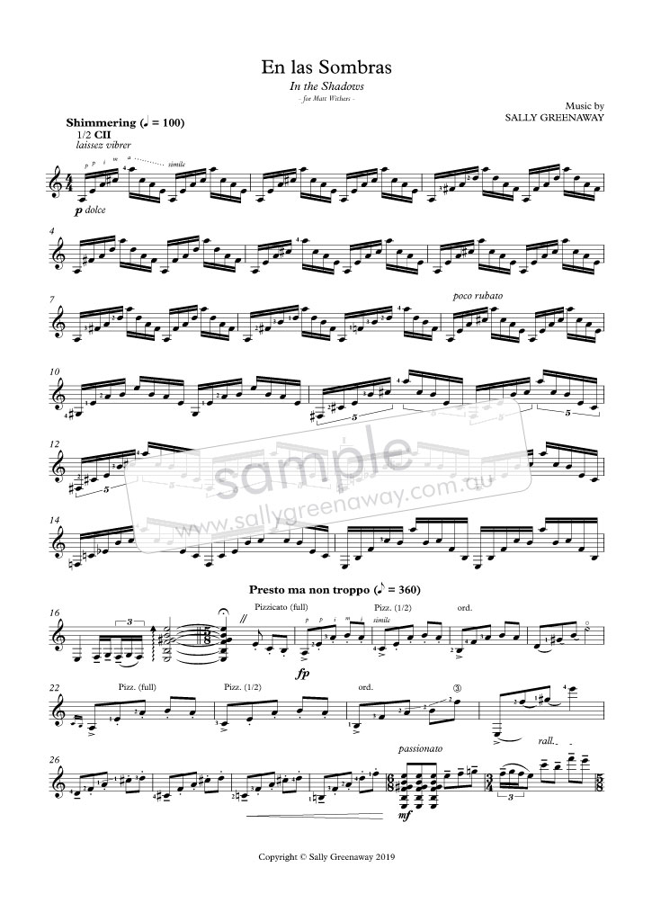 En Las Sombras - in the shadows is a vibrant and rhythmic solo guitar piece by award-winning Australian composer Sally Greenaway. Brilliantly performed by leading Australian guitarist Matt Withers on his stunning hand-made Smallman & Sons classical guitar, the piece explores the guitar's rhythmic and colour possibilities with exuberant tests of the performer's virtuosity and technique.