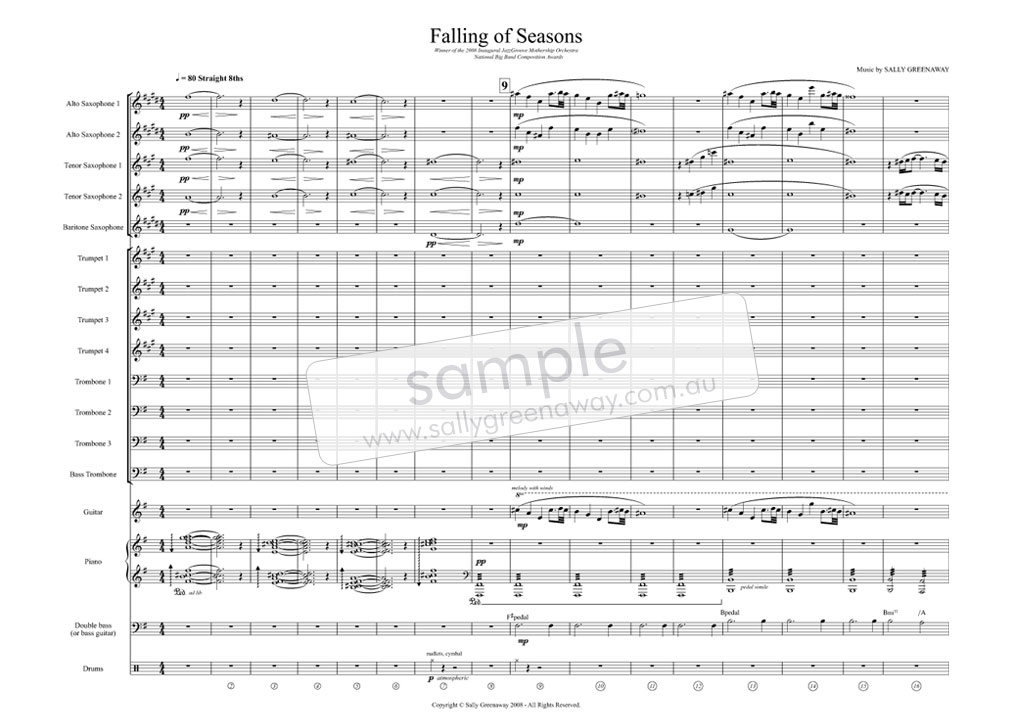Instrumentation: Big Band (with doublings): 2 Alto Saxes (doubling Flutes), 2 Tenor Saxes (doubling Clarinets), Baritone Sax (doubling Bass Clarinet), 4 Bb Trumpets (Trumpets 1 and 2 doubling on Flugelhorns) , 3 Tenor Trombones, Bass Trombone, Rhythm Section (Piano, Guitar, Bass, Drums). The solo passage features Alto Saxophone. Double Bass part is difficult (heavily notated ostinato-based lines).