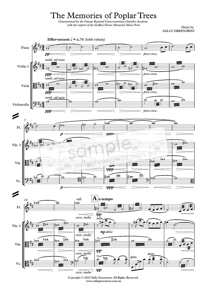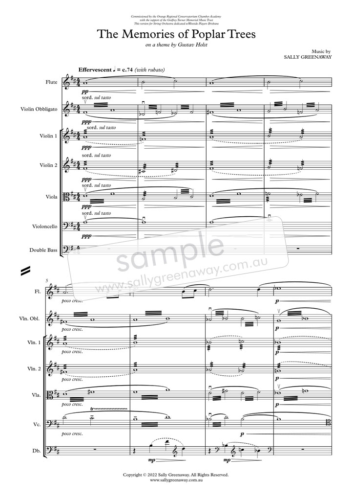 The symbolism of both Holst's Venus and the Poplar avenue plantings combine and intersect for the inspiration for this piece, The Memories of Poplar Trees. Greenaway's writing demands the performers to stretch their command of soft playing, in order to create a peaceful and ethereal sound world.
