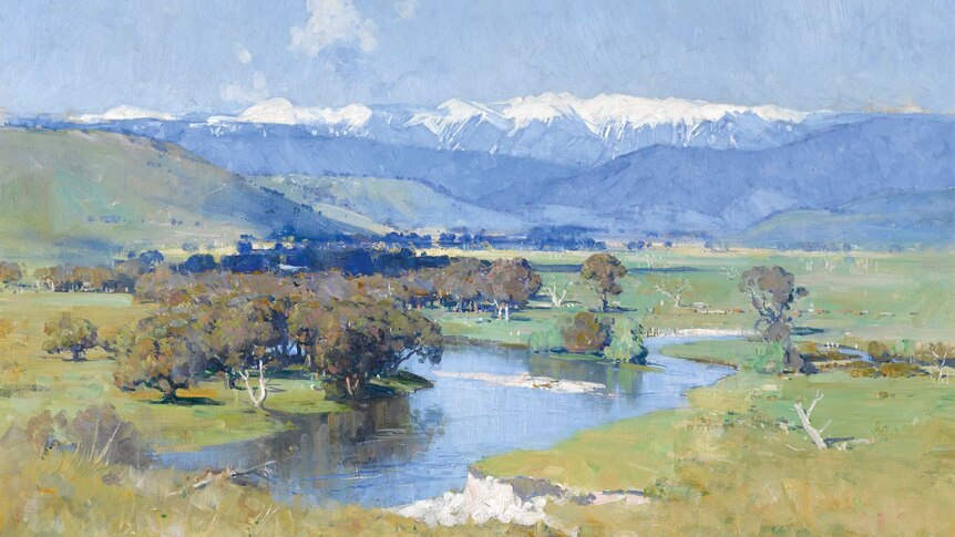 Streeton considered this painting crucial to Australia's national identity, depicting the unique scenery nearby to Corryong, with snow-capped ranges and Mount Kosciuszko in the distance and idyllic farm land flanking the Murray River.