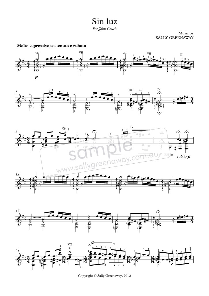 Sin Luz - without light. Sublime and introspective with a lamenting, heartfelt melody and a broody harmonic palette. Commissioned as part of a set of contrasting works for guitar by John Couch. The piece emerged during a time when the composer was feeling completely lost - her husband was seriously ill in hospital and doctors told her that he may potentially die. The seriousness of potentially losing him and the devastation one feels when confronted with that situation is at the heart of this piece.