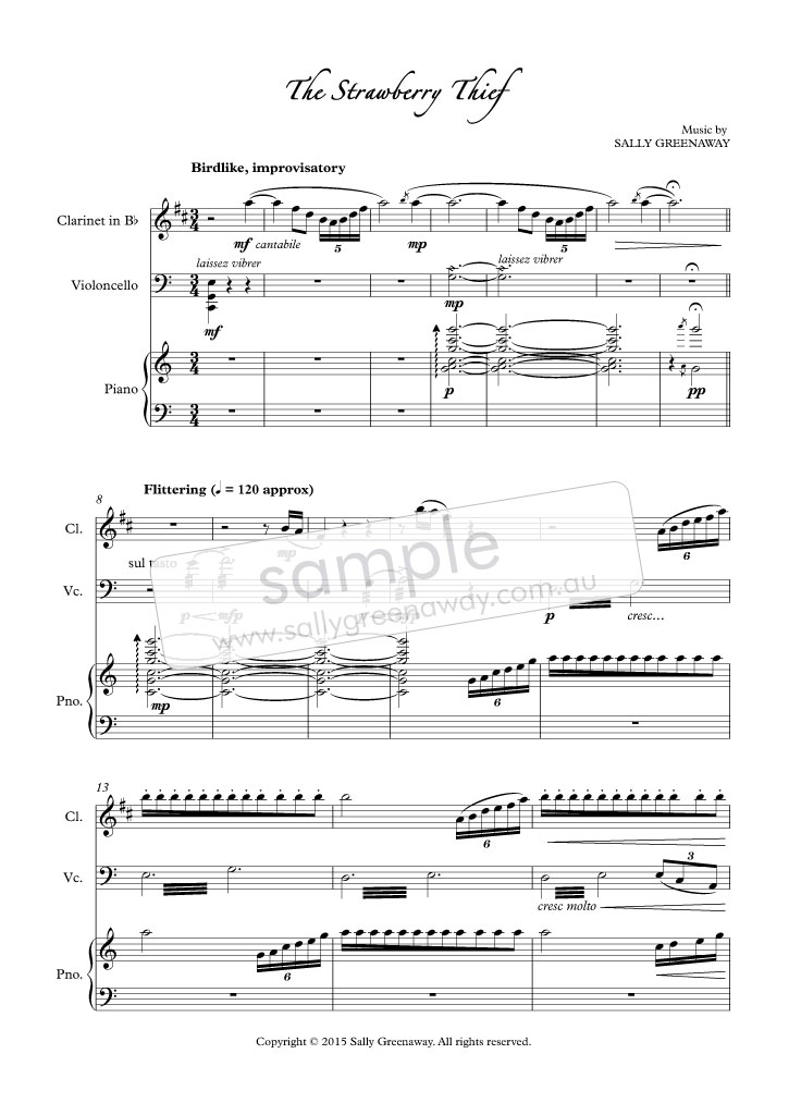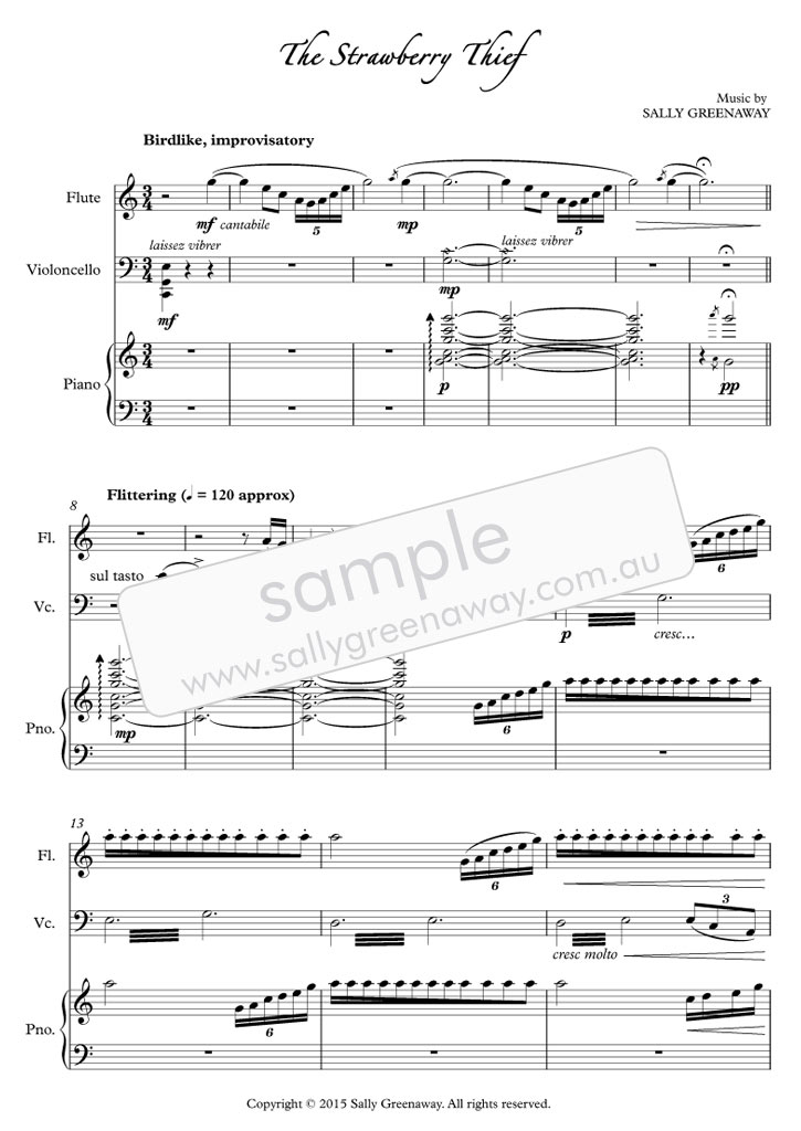 The Strawberry Thief (suite) for flute, cello and piano, brings delight from Australian composer Sally Greenaway. The suite comprises three musical snapshots, inviting us into a world of birds, gardens and cheeky foxes: